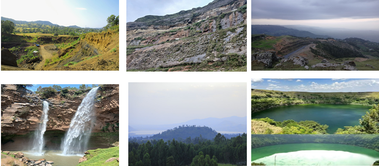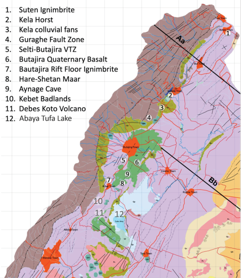 The geopark encompasses the Butajira volcanic field, which stretches approximately 80 km in a northeast-southwest direction and consists of numerous basaltic cinder cones, maars (crater-like volcanic depressions formed by explosive eruptions), and extensive lava flows. These volcanic features are predominantly Quaternary in age, reflecting recent geological activity related to the rift's extension. The region's rock formations include Late Miocene to Pleistocene ignimbrites, basaltic flood lavas, trachytic lava flows, pyroclastic deposits, and rift-related sedimentary sequences. The tectonic framework is dominated by major faults such as the Guraghe fault zone and the Silti-Debre Zeyit fault system, which serve as boundaries and conduits for magma movement and geothermal fluids. Geothermal potential is evident through subsurface conductive layers and thermal surface manifestations, linked to these fault-controlled structures. Petrochemical studies show the basalts derive largely from a homogeneous mantle source with evidence of shallow crustal magma differentiation.